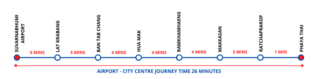 To Travel to and from Suvarnabhumi airport simply go to any of the stations mentioned in the image above and look for the Airport Rail link section. The cost from the Airport to Phaya Thai is a whopping THB 45 per person 1 way and takes only 26 minutes.