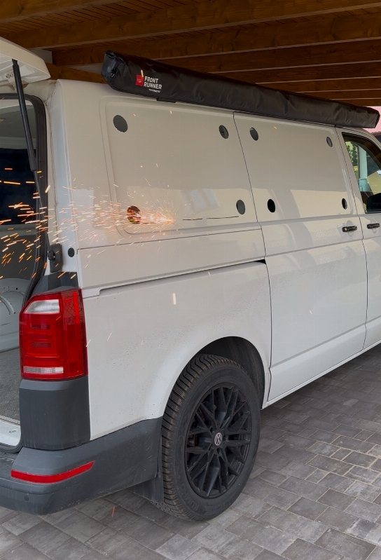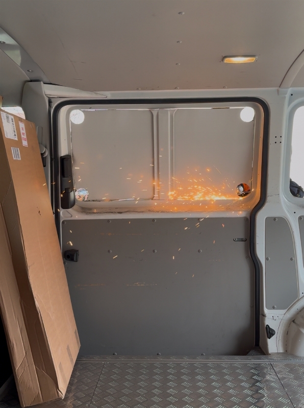 We then drew lines, used a sabre saw and cut the holes out for the left side of the windows. I had to use my angle grinder to fix up those cuts to put the beading in. For record, We decided to do one side first so that we could line them up which was one of the little tips we got online.
