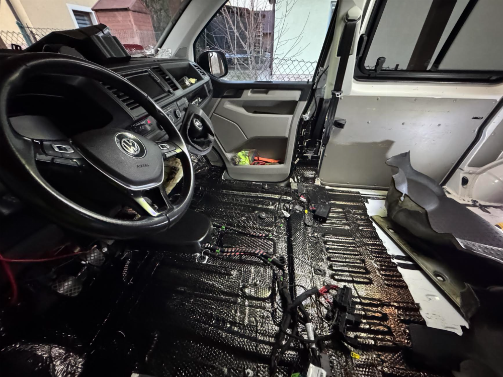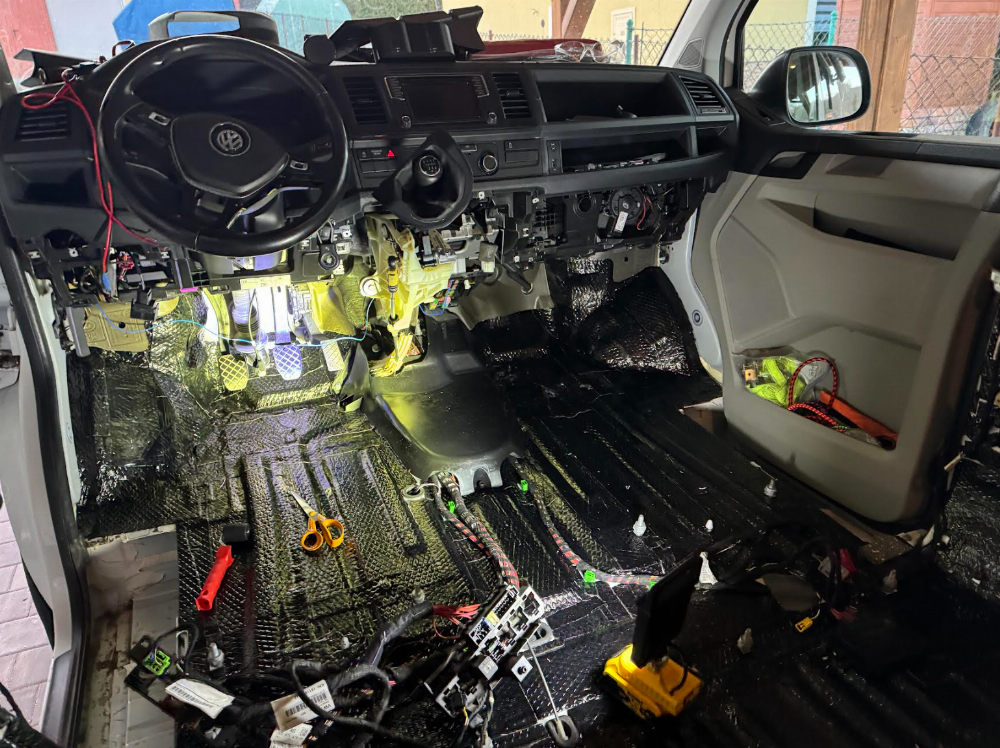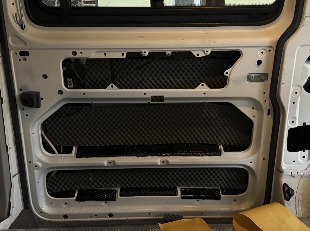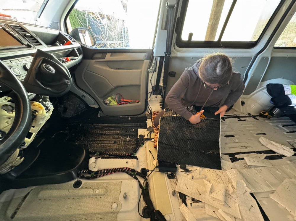 One thing we hated with a passion was how ‘tinny’ the van sounded. It made me think of an empty Coca-Cola can being kicked down the road. We bought a large amount of Dynamat, Sound deadening and insulation wool. The first step was to clean the steel skin so that the Dynamat would stick, then on top of that we stuck the sound deadening and then the wool. It changed how much noise came into the cabin.