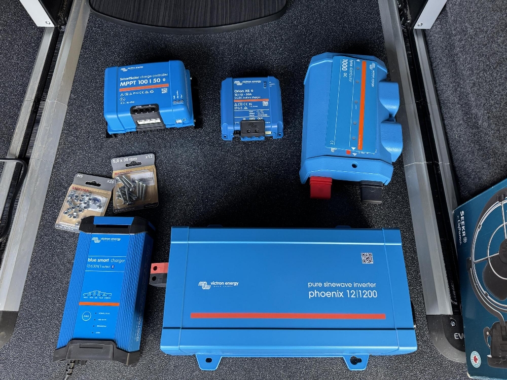 Now that the van was really starting to take shape, we had a clear idea of our power requirements, so it was time to order all the Victron hardware. The biggest challenge was not choosing the components, but working out where everything would live. With the weather being pretty miserable, I grabbed a sheet of paper, traced out the space where the system would be installed, and spent a good while sliding paper cut outs of each component around until the layout made practical sense.