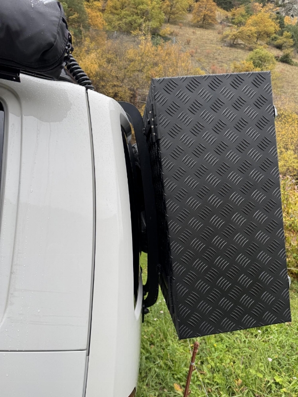 We decided to have a custom sized aluminium storage box made for the back of the van. I have always been impressed with the build quality of the spare wheel carrier from UB Components, so I bought another one of their brackets, cut it up and welded a bespoke mount to support the box.